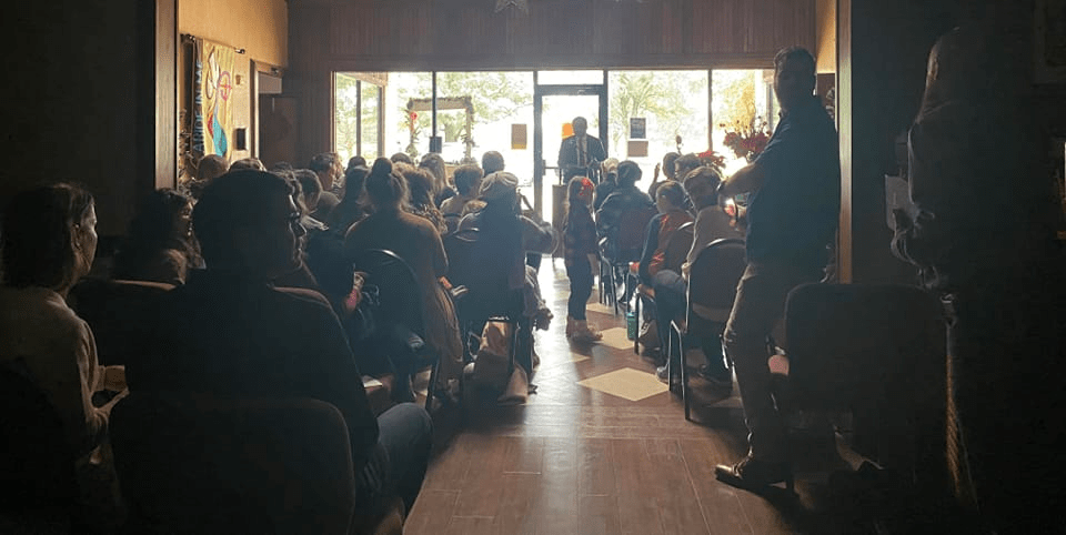 Worship service being conducted in the lobby of the building we rent when the power went out.
