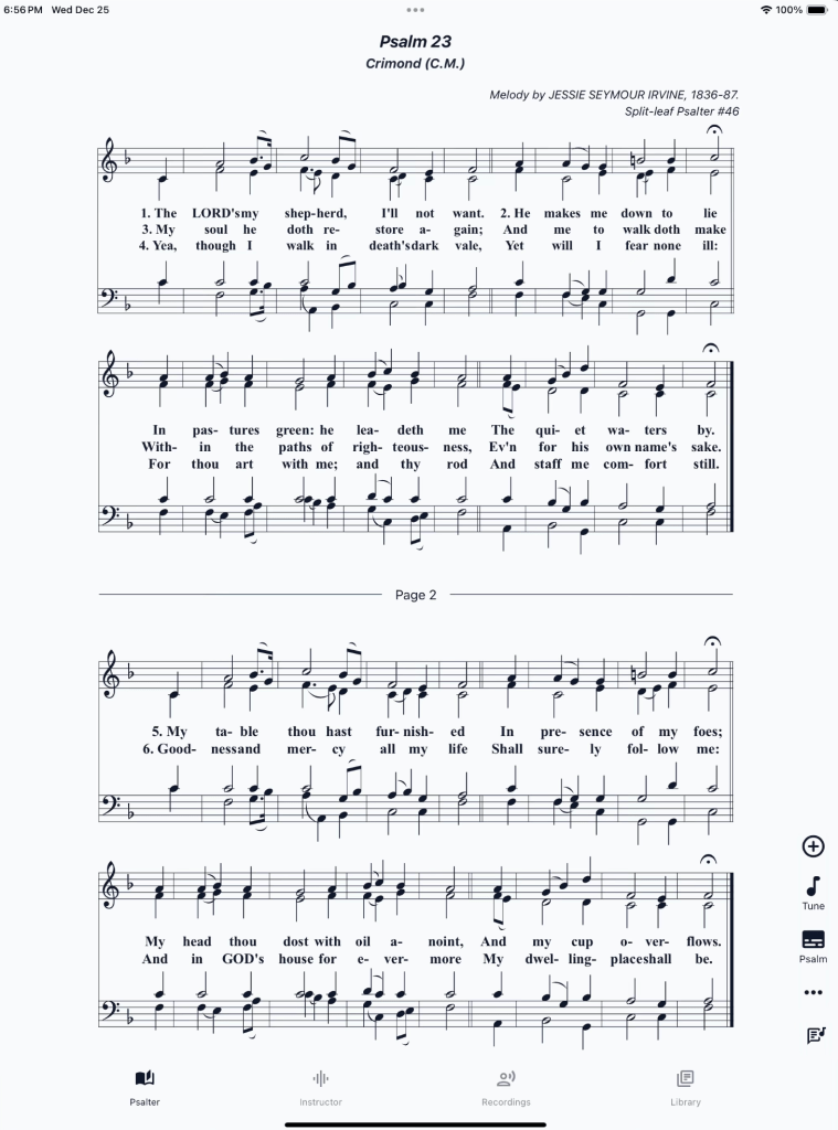 Rather interestingly, the 1650 psalter is well suited for a digital format due to the lack of copyright and flexibility of the matching of tunes to the words. Digital allows for what paper cannot. Around seven years ago, I released the 1650 Split Leaf Psalter on the App Store and Google Play. That app introduced psalm singing to tens of thousands of people. To this day, saints all over the world continue to use it and have conveyed to me how the Lord brought them to sing the psalms by it.